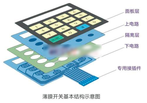 薄膜開關是集按鍵功用、指示元件、儀器面板為一體的一個操作系統。是選用PC,PET,FPC及雙面膠等軟性資料,運用絲網印刷技術制造而成的 多平面組合密封的集圖形、按鍵、標記符號顯示、導電及薄膜開關功用于一體的塑膠電子制品。廣泛應用于電子通訊、工業操控、醫療器械、汽車工業、儀器儀表、家用電器、兒童玩具、軍工設備等行業和領域。常見薄膜開關各部分組成原料: